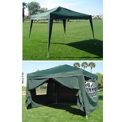 500 denier heavy duty, professional polyester top is UV protected.   Lightweight rust resistant steel frame design built with strength and stability.  Ropes and stakes included in each kit.  Ideal for commercial or recreational use - parties, weddings, flea markets, etc.  Can be erected on hard surfaces such as decks, driveways, etc.  Walls attach with Velcro fasteners. Sidewalls are easily removed for open air exhibits or outdoor events with overhead protection.  Four sidewalls 2 with large pane windows for maximum light and viewing - 2 walls with zippered closures.  Carry bag Included. Shipping Dimensions 49" x 10" x 10" Ship weight: 39 lbs  Color is green.  Brand New.  Manufacturer: Confidence has been making quality sporting goods for over 35 years. We are not responsible for damage to the unit sustained while erected in winds more than 10 MPH. All sales on this item are final. We will not accept returns.