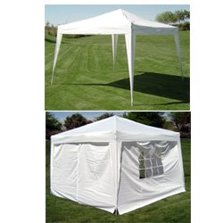 500 denier heavy duty, professional polyester top is UV protected.   Lightweight rust resistant powder coated steel frame design built with strength and stability.  Ropes and stakes included in each kit.  Ideal for commercial or recreational use - parties, weddings, flea markets, etc.  Can be erected on hard surfaces such as decks, driveways, etc.  Walls attach with Velcro fasteners. Sidewalls are easily removed for open air exhibits or outdoor events with overhead protection.  Four sidewalls 2 with large pane windows for maximum light and viewing - 2 walls with zippered closures.  Carry bag Included. Shipping Dimensions 49" x 10" x 10" Ship weight: 39 lbs  Color is all white.  Brand New.  Manufacturer: Confidence has been making quality sporting goods for over 35 years. We are not responsible for damage to the unit sustained while erected in winds more than 10 MPH. All sales on this item are final. We will not accept returns.