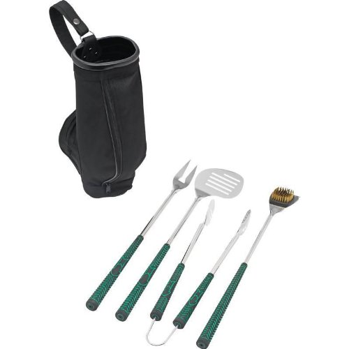 Set includes: fork, tongs, slotted spatula, and grill brush. Features rubber, golf club style handles. All store in a 16-1/4" replica golf bag. Limited lifetime warranty. Gift boxed.