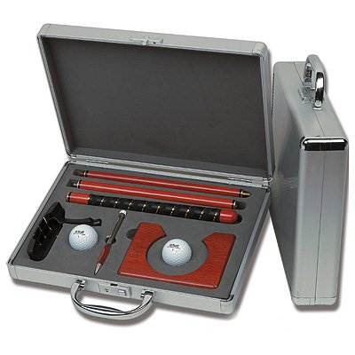 This Unique Spectrum Set is elegantly handcrafted in premium quality maple wood with final touch of rosewood finish, perfectly balanced with the three part shafts, the well precision putting head, the wooden cup and two Titanium golf balls. This stylish executive gift packaged with the award wining Golf Masterpiece Ballpoint Pen, all-in-one deluxe aluminum traveling hand-carrying case packaged in a gift box makes a perfect gift for any occasion for anyone. Case: 13-1/2 L x 10 W x 2-1/2 D