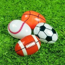2.5 inch 2 piece snap together plastic eggs in assorted sports ball designs. Fill with candy or small easter toy treats, sold separately. Sold in units of 12 eggs.