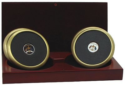 Set includes 4 Antique Brass/Black Leather Round Coasters measuring 3 1/2". Each coaster includes the Official 2008 Ryder Cup logo ballmarker.  Mahogany display box measures 9 1/2 x 4 1/2 and also has the Official 2008 Ryder Cup logo ballmarker on cover of the box.  Great gift for someone who has everything.