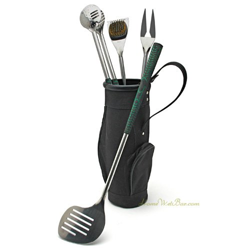 Fore! Look out for great steaks and burgers after you get your hands on these barbecue tools. This 5 piece set includes a grilling fork, slotted spatula, tongs, and a wire grill brush. All the grilling utensils are accented with real rubber golf club grips and the set comes complete with a mini golf bag for easy portability. Bag measures 14.5 tall and tools measure about 22 long.