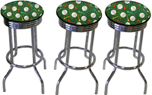 These are new, 29 inch, chrome, custom / specialty barstools. They have footrests and a swivel seat. The seat is made of a golf ball & tee fabric.