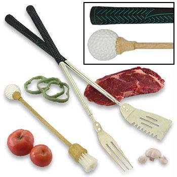Model Number :BA-2502  Put a little swing into your backyard grilling with this 3-piece Golf   BBQ Set.   Each tool has a soft insulated grip just like the ones on your real clubs   and look like golf accessories!   The Golf-BBQ set are quality made grilling utensils that will bring you   years of use and enjoyment.   The Golf BBQ Set  features three grilling essentials: a large   fork, spatula and basting brush.   The grill heads are removable for easy cleaning and storage.   For those that love the game of golf, as well as creating a great BBQ   meal, Golf-BBQ is the perfect gift for the golfing gourmet.   Features:       23' Fork     23' Spatula     13.5' Basting brush     Removable grill heads for easy cleaning and storage